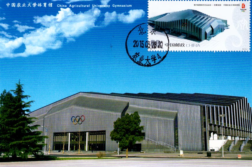 中国农业大学体育馆邮票如下图(这张极限片不交换)。本来学院路邮局有农大东区的风景戳来着,但是前几个月上缴了TAT