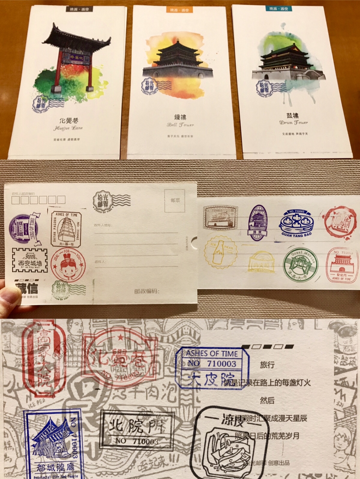 六张拾光邮驿出品的藏信片。3张化觉寺,2张鼓楼,1张钟楼,每张里的戳都是一样的19种。这周末就从西安寄><
