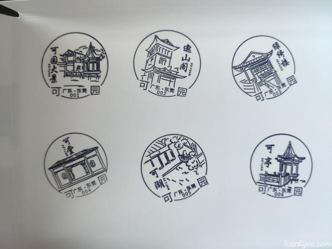 一套有6张片,章如图,一个是【东莞首家主题邮局开业纪念章】,一个是对应片的景点的【可园景点章】