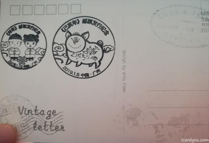 整理明信片时发现还有一张戳片没寄出去,这是过年时我去广州盖的,有一个戳有点瑕疵,没盖好。不是实地寄出,不介意的就来吧。