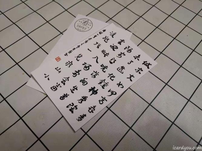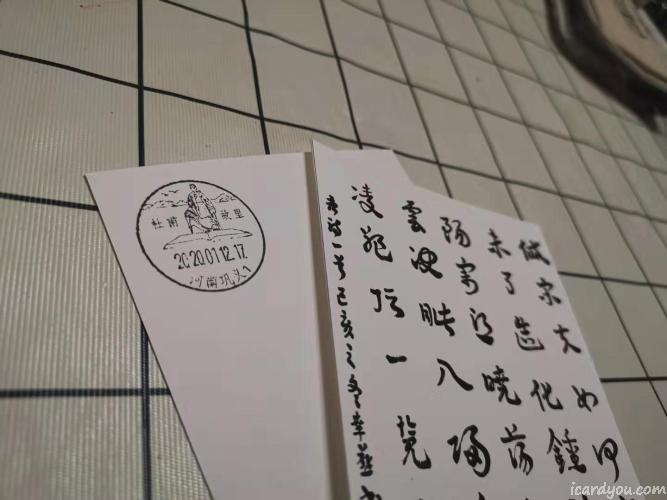 关于杜甫的明信片,这是我的自制明信片,正面是我妈妈的书法作品,杜甫的五言律诗《望岳》,背面,是杜甫故里的风景戳,我会在2020.01.12的下午寄出,所以活动会截至到中午,喜欢的朋友,来参加吧。