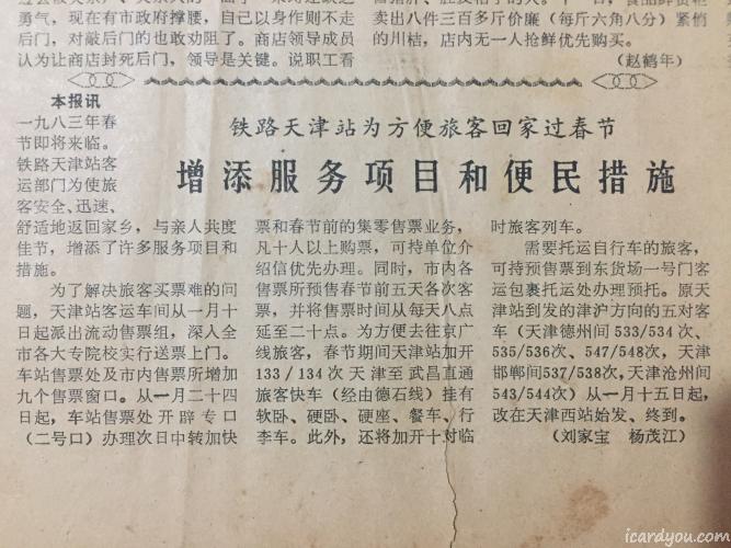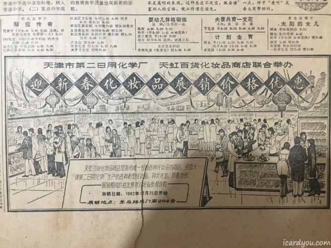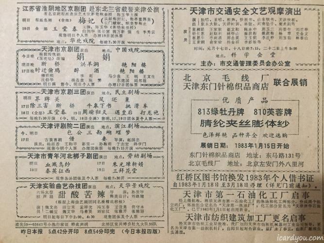 很多年前我在家里翻出一份泛黄的1983年1月15日的天津日报,满满的年代感,比我都大了10多岁。现在想起这份报纸,又拿了出来打算翻拍几块儿在网上打印成明信片互寄。内容有报纸名、广告、文艺演出信息、漫画、新闻。
