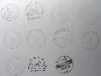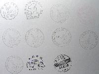 一种是空白片,真正的戳片,囧~完全的正面开始敲戳,图一就是一张这样的空白片,有些敲不下的戳,反面空白处也有敲,这类片每种戳都有。这类片可能有的戳敲的不是很好,有点脏,因为是300g的铜版纸。每张11个戳。