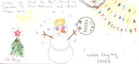 收到俄国妹子寄来的自制片,文字面手绘了圣诞雪景,画得真逼真,雪人的眼睛是用两颗纽扣做的 )